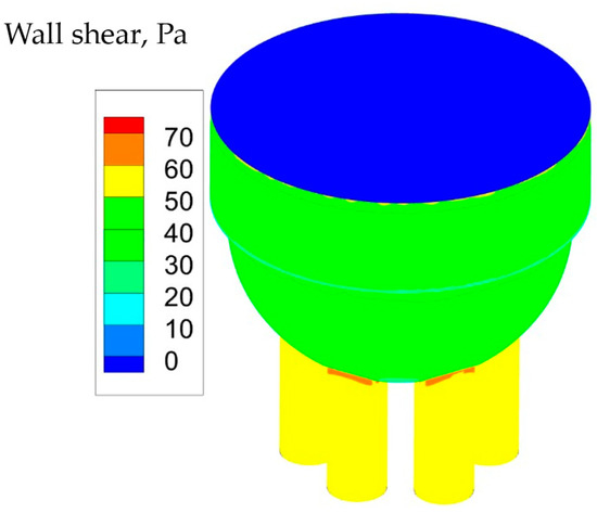 Figure 7 and Figure 8 show how the apparent viscosity varies along the die for the non-Newtonian working fluid. Figure 7a shows that along the center (X-Y) plane at the core of the die, viscosity is larger, while near the wall, due to the higher strain rate (see Figure 6a), the apparent viscosity is smaller. Wall shear stress increases along the flow direction (Figure 9). There is an abrupt increase of shear when the flow starts to enter the outlet pipes (narrow red areas in Figure 9). Because of high shear stress, flow starts to have larger deformation that causes higher shear strain. As the feed fluid is shear thinning, viscosity starts to reduce.