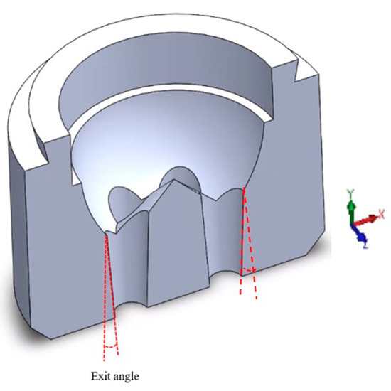 To reduce the shear stress and, consequently, the needed pressure drop, the exit angle of the die (see Figure 11) varies from zero degrees (straight exit pipe, Figure 12a) to eleven degrees (converging pipe, Figure 12f). Curvilinear surface cut from the reservoir section beyond nine degrees of the exit angle (Figure 12f).