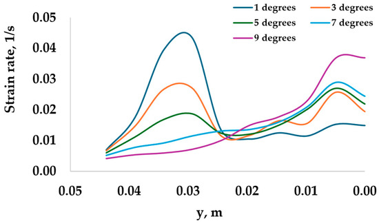 Figure 15 shows the variation of strain rate along the outlet pipe for different exit angles. At lower angles, from 1 degree to 5 degrees, there is a visible maximum and following drop of strain near the interface of the exit pipe and reservoir. Farther downstream of the interface, the strain rate increases. For larger exit angles of 7 degrees and 9 degrees, the strain rate increases gradually from the interface toward the exit of the outlet. The overall increase in strain rate is more substantial for higher exit angles compared to lower exit angles.