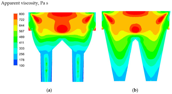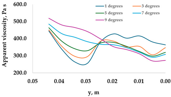 Apparent viscosity distribution at the vertical plane for the following exit angles: (a) 1 degree and (b) 11 degrees.