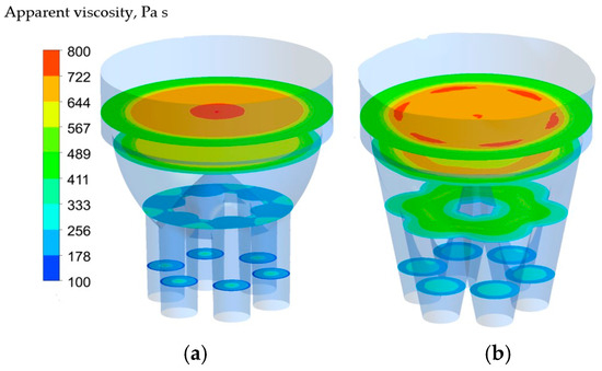 Apparent viscosity for non-Newtonian fluid in die: (a) at the X-Y plane and (b) at horizontal planes at the same vertical locations as in the prior Figure.