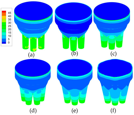 Optimization of the exit angle of the die: (a) zero degrees, (b) 3 degrees, (c) 5 degrees, (d) 7 degrees, (e) 9 degrees, and (f) 11 degrees. The angle in degrees is shown in each sub-figure.
