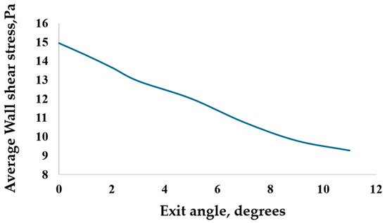 Figure 19 and Figure 20 show wall shear stress as a function of die exit angle. With the increase of exit angle, the shear stress at the wall decreases. This explains the dynamics of pressure drop between the exit and entrance of the die with the variation of exit angle depicted in Figure 14. Note that for the present die design, the angle is zero degrees (straight die).