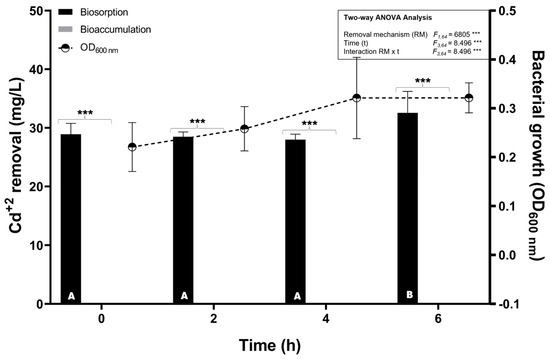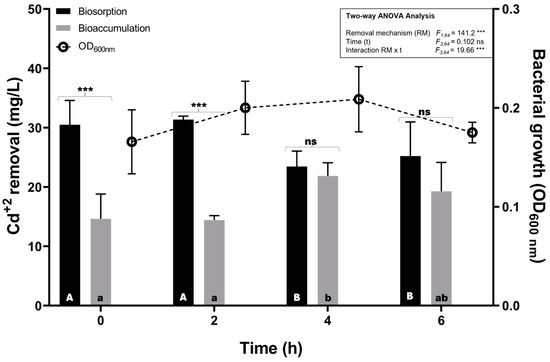 Cadmium [Cd+2] removal through B. zhejiangensis CEIB S4-3. The asterisks denote significant differences between biosorption and bioaccumulation in each sampling time (ns p > 0.05; *** p ≤ 0.001). Different capital letters denote differences in biosorption across time. Different lowercase letters denote significant differences in bioaccumulation across time.
