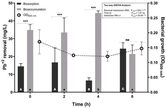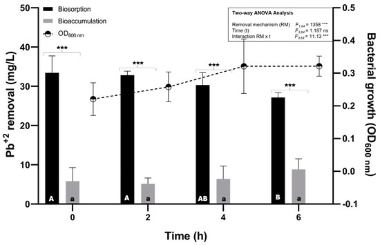 Lead [Pb+2] removal through B. zhejiangensis CEIB S4-3. The asterisks denote significant differences between biosorption and bioaccumulation in each sampling time (ns = p > 0.05; *** p ≤ 0.001). Different capital letters denote differences in biosorption across time. Different lowercase letters denote significant differences in bioaccumulation across time.