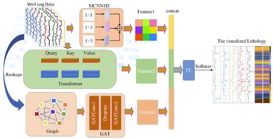 With the increasing availability of logging data and advancements in computer science, machine learning techniques have been widely applied in log interpretation []. Machine learning methods can discover correlations between multidimensional data by integrating and learning feature attributes from logging curves. However, traditional machine learning methods often struggle to effectively distribute data, resulting in low accuracy when handling complex, imbalanced multi-label lithology datasets. To overcome these limitations, this study introduces an ensemble approach that integrates MCNN1D, GAT, and Transformer models. This framework is designed to address key challenges such as inter-sample correlation extraction, spatial relationship modeling, and long-range dependency capture. By leveraging the unique strengths of each model, the proposed approach not only improves predictive accuracy but also effectively alleviates the issue of imbalanced lithology data.