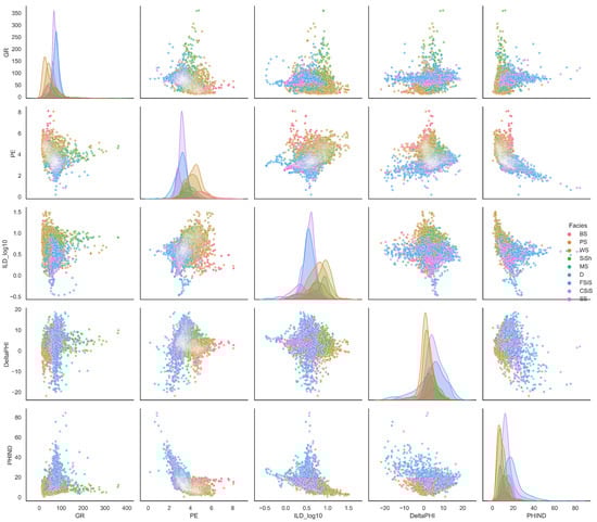 Scatter plot matrix of logging variables for lithology types in the Hugoton–Panoma dataset.
