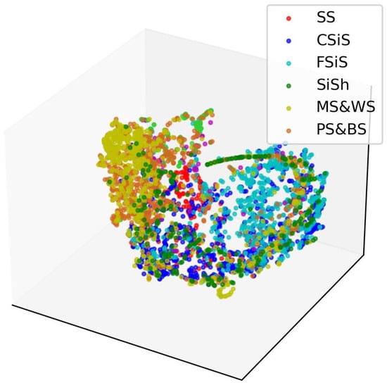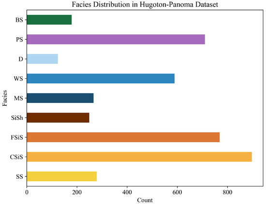 To present high-dimensional samples more intuitively, we applied t-SNE to reduce the data to a three-dimensional space, with the visualization results shown in Figure 3. The distribution of lithofacies categories in the Hugoton–Panoma dataset, as shown in Figure 4, reveals a significant class imbalance. Categories like CSiS and FSiS have the highest counts, while BS and D are comparatively less represented. This indicates that the region’s lithology is characterized by category imbalance and multi-label complexity, with indistinct boundaries and excessive proximity between different lithologies, making it challenging to differentiate them.