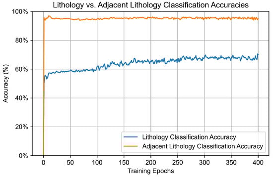 If similar lithologies are grouped into the same category based on the adjacent lithology relationships described in previous studies, the trends in training accuracy for lithology and adjacent lithology, as demonstrated by the model proposed in this paper, are shown in Figure 5. After 400 training epochs, the accuracy for adjacent lithology reaches 95.06%.