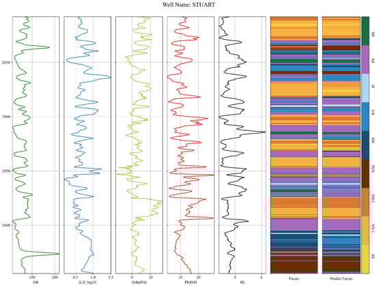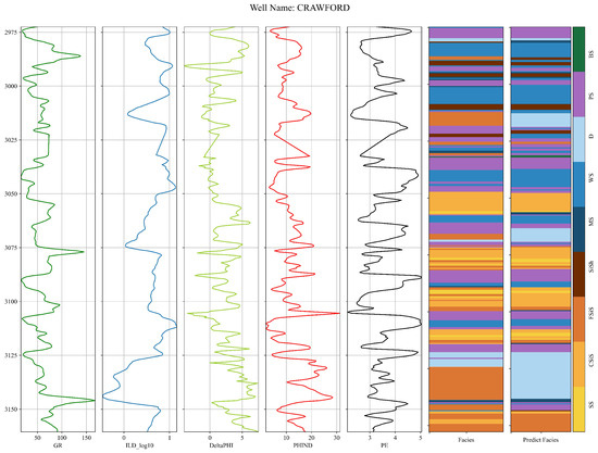 In this study, we selected ten wells from the Hugoton–Panoma dataset to construct the training set, leveraging the diverse logging profiles of these wells to capture the variability in lithology and other geological characteristics. To evaluate the generalizability and accuracy of the proposed model, two wells (STUART and CRAWFORD) were designated as blind wells. These blind wells were excluded from the training process, enabling a rigorous assessment of the model’s performance on unseen data. Incorporating blind wells as test cases allows us to quantify the model’s predictive accuracy in practical scenarios, affirming its potential application across neighboring wells. This setup replicates real-world conditions where a model trained on known wells is applied to predict characteristics in newly encountered, adjacent wells.