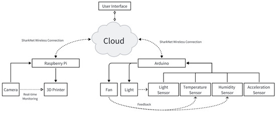 - Video Monitoring and Remote Control Nodes: The Raspberry Pi controls an HD camera that continuously acquires real-time video streams of the printing process, and the module connects to the cloud via SharkNet to support remote monitoring and control.
