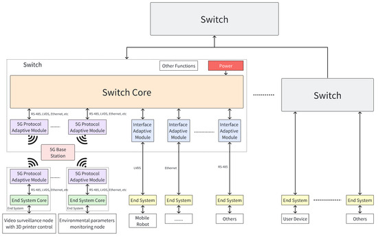 - SharkNet dynamic network: SharkNet has many advantages such as support for multiple topologies, redundant transmission, and multi-interface adaptation, and the most important feature of the network is the intelligent reconfiguration of the network. In addition, the network integrates technologies such as dynamic multipath scheduling and 5G [26,27], which makes the network more robust to break through data transmission bottlenecks in multi-device parallel operation. Therefore, the network has the advantages of both wired network’s low latency and wireless network’s flexibility, which makes it possible to improve the overall performance of the system while still ensuring the flexibility of the system, providing a strong real-time, highly reliable, highly dynamic, highly fault-tolerant, and easy-to-use communication network solution for the system.