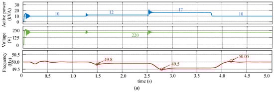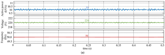 Figure 8 shows the control performance of the traditional VSG with constant parameters and the proposed fuzzy adaptive inertia-based VSG method, respectively. First of all, both methods can maintain the power grid frequency at 50 Hz at the rated load. This illustrates that the VSG methods regardless of adaptive parameters can effectively control the power grid. Secondly, by carefully comparing Figure 8a,b, the active power and voltage fluctuations of the traditional method are slightly larger than those of the proposed method. These indicate that the proposed VSG method is able to make the system work stably. It is possible that the constant virtual inertia of the traditional VSG method is not tuned at the best level. In practice, if the higher control performance of the traditional VSG is needed, complex tuning process is required. This is the disadvantage of the traditional method compared to the proposed one.