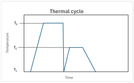 For this heat treatment to occur, it is necessary to first heat the alloy to a specific temperature to form a homogeneous mixture from the solid solution. After homogenization, the solution is rapidly cooled to a temperature T1, a process known as quenching, preventing sufficient time for atoms in the solution to diffuse. Finally, the alloy is heated to an intermediate temperature between the homogenization temperature and T1, where atoms can diffuse over short distances, initiating the formation of precipitates. It is then held at this temperature for a specific duration to allow the reaction to reach equilibrium. Finally, the alloy is cooled to reach room temperature [30]. Figure 3 schematically illustrates the process variables. T0 represents the temperature for complete mixture homogenization, T1 is the cooling temperature, and T2 corresponds to the intermediate temperature necessary for precipitate formation.