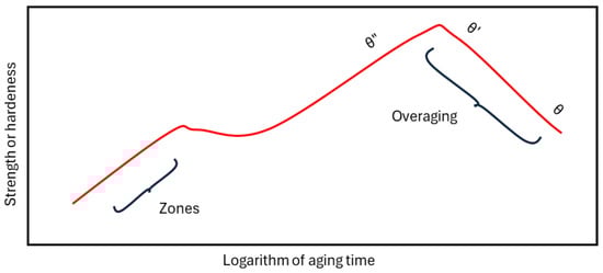 Mechanical strength or hardness as a function of the logarithm of aging time, at a constant temperature. In the beginning, solute zones are formed, increasing the strength/hardness, characterized by formation of Guinier–Preston zones. So, an intermediate precipitate θ″ is formed, offering a maximum strength/hardness. The overaging is a state where larger and more stable precipitates (θ′ and θ″ begin to grow and cause a loss in the properties. Finally, the θ phase is fully formed and these large precipitates result in a considerable reduction in hardness.).