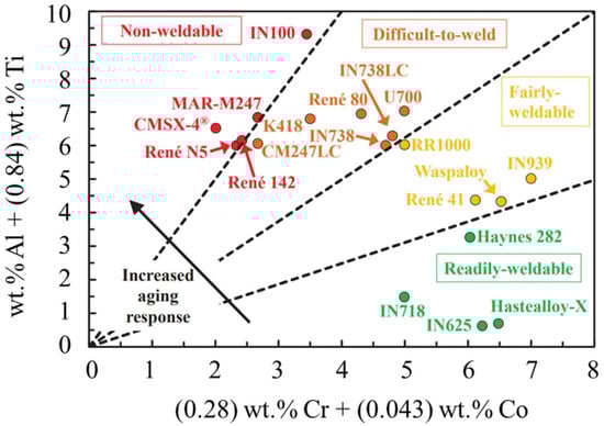 Weldability of various alloys determined by the Al/Ti x Cr/Co content [33].