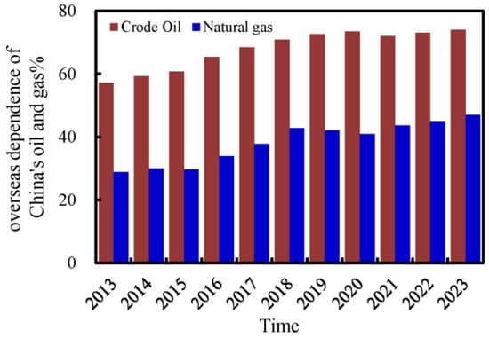 Overseas dependence on crude oil and natural gas during 2013–2023.