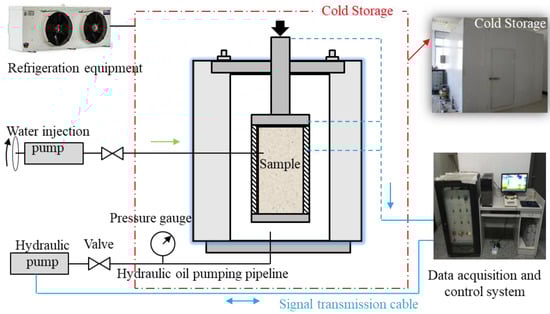 Investigating the mechanical properties of hydrate-bearing sediments requires the use of a low-temperature triaxial mechanical property experimental system, as shown in Figure 2. This experimental system is specifically designed for preparing temperature-sensitive sediment samples, such as permafrost and hydrate-bearing sediments, and for investigating their mechanical properties. As illustrated in Figure 2, the system primarily consists of a cold storage unit, a data acquisition and control system, a low-temperature triaxial mechanical testing apparatus, and a confining pressure loading system. This experimental system allows for both the in-situ preparation of hydrate-bearing sediment samples and the simultaneous conduction of mechanical property experiments.