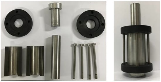 Hydrate-bearing sediments typically exhibit a series of characteristics, including poor diagenesis, strong temperature sensitivity, and a tendency to melt easily. Although the coring operations in hydrate-bearing sediments are not technically challenging, the sediment samples obtained are highly precious and confidential [39,40]. Therefore, experiments on the mechanical properties often rely on artificially prepared hydrate-bearing sediment samples. Figure 3 illustrates the equipment used to artificially prepare hydrate-bearing sediment samples. As can be seen in Figure 3, the sampling mold is a composite structure consisting of two mold halves, top and bottom ring sleeves, a pressure piston, and assembly screws.