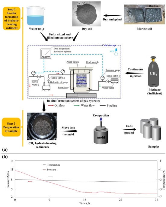 (a) The preparation process of hydrate-bearing sediment samples, (b) evolution of temperature and pressure in an autoclave.