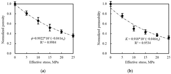 The effect of effective stress on porosity and permeability can be accurately modeled using exponential functions, as shown in Equations (14) and (15), respectively.