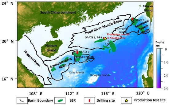 China began its oil and gas exploration and development activities in the South China Sea several decades ago [47,48,49]. However, the Chinese government’s exploration of natural gas hydrates in the region did not commence until the 1990s. Based on the findings of four large-scale explorations, the northern South China Sea has been designated as the primary focus for China’s hydrate development efforts. Thus, the northern South China Sea, depicted in Figure 9, serves as the study area for this research. There are four basins in this area, namely Yinggehai Basin, Qiongdongnan Basin, Pearl River Mouth Basin and Southwest Taiwan Basin. Notably, the Shenhu area, located in the Pearl River Mouth Basin, is the primary area selected for hydrate trial production activities and simulation investigations. The China Geological Survey carried out two trial production operations in the Shenhu area in 2017 and 2020, yielding daily gas production of 0.5 × 10⁴ and 2.87 × 104 m3/d, respectively [50,51,52]. The proven significant development potential is also one of the key reasons for selecting this area as the study area in this study [53]. Due to the confidentiality of such information pertaining to the South China Sea and gas hydrates, the data used in this study were all obtained from published papers [54,55]. Based on the collected data, the SH2 site in the Shenhu area has been selected as the study area.