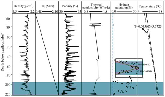 where ρs is the floating weight of the sediment skeleton, and g is the gravity acceleration. D represents the vertical depth between the hydrate reservoir and the seabed, while H denotes the depth of seawater at the investigation site.