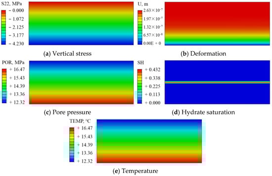 where v0 is the Poisson’s ratio of hydrate-bearing sediments when effective stress is 0. Based on Equations (6) and (7), the elastic modulus and Poisson’s ratio of hydrate-bearing sediments can be traversed with the USDFLD subroutine with two field variables: stress and hydrate saturation. For the convenience of readers pursuing subsequent investigations, the main code and description of the USDFLD subroutine are provided in Appendix A.