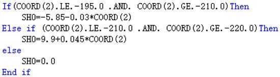 Based on the self-developed USDFLD subroutine code, the variation of sediment physical parameters, hydrate dissociation, and the dynamic advancement of the dissociation front during the simulation are implemented. In the ABAQUS platform, two field variables (i.e., FIELD (1) and FIELD (2)) are pre-designed, which represent the hydrate saturation and the effective stress, respectively. At the same time, the corresponding relationship between each physical property parameter and two field variables (see Equations (6), (7), (10), (11), (16) and (17)) is introduced into the “Property” module of ABAQUS 2016 software. The detailed codes are as follows.