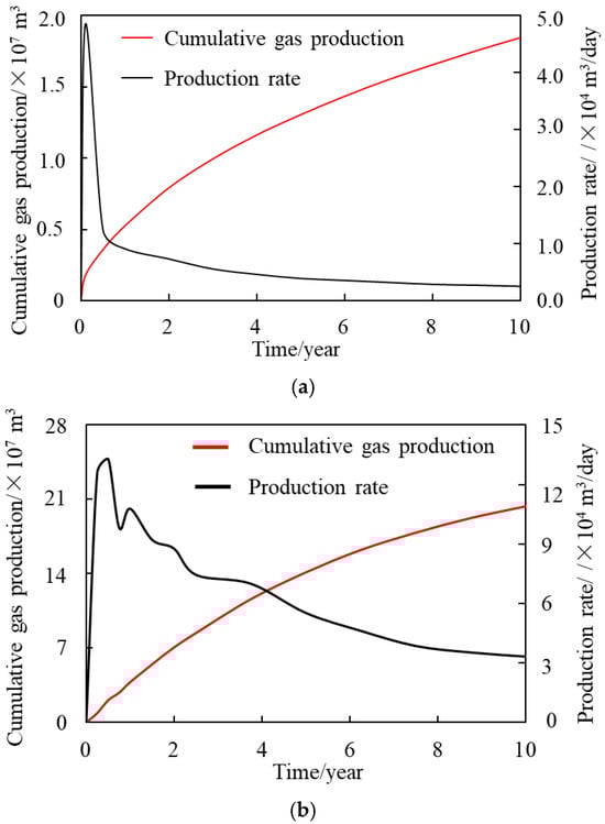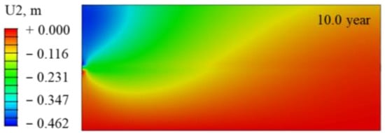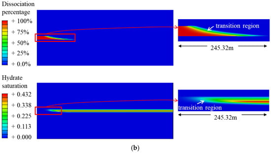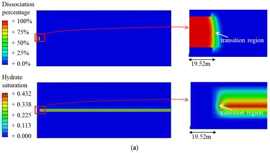 As shown in Figure 18, although gas hydrate dissociation is intense in the first 0.1 years of development, the dissociation range around the wellbore remains narrow. The cement in the hydrate reservoir section has maintained its bond with the sediments around the wellbore, and the wellhead remains generally stable [68]. At this stage, the sinking of the wellhead is primarily affected by sediment subsidence, and its sinking pattern follows that of the sediment subsidence. After 0.1 years of hydrate development, the sinking of the wellhead is only 1.24 cm. When the development time exceeds 0.1 years, the dissociation of gas hydrates over a wide range around the wellbore causes the sediment to lose its bonding and supporting properties with the wellhead system. The instability and sinking of the wellhead were particularly pronounced between 0.1 and 0.35 years, with a rapid increase from 1.24 cm to 89.40 cm. Nevertheless, throughout this period, the maximum subsidence of the strata increased only from 1.24 cm to 7.86 cm. It can be inferred that during this period, significant and gradually intensifying slippage occurred between the wellbore system and the sediment. When the development operation lasted for 0.35 years, a relative slip of 81.54 cm was observed between the wellhead and the sediments. After 0.35 years of development, the support force at the base of the wellhead system gradually surpassed the frictional force exerted on the casing, thereby providing the necessary support for the wellhead system [69]. Subsequently, the wellhead system gradually sinks along with the sediments, following a sinking trend similar to that of the sediment subsidence. After 10 years of development, the wellhead’s final absolute sinking reached 1.350 m, with slippage relative to the sediments being the predominant contributing factor. The relative sinking reached 0.920 m, accounting for 68.15% of the total sinking.