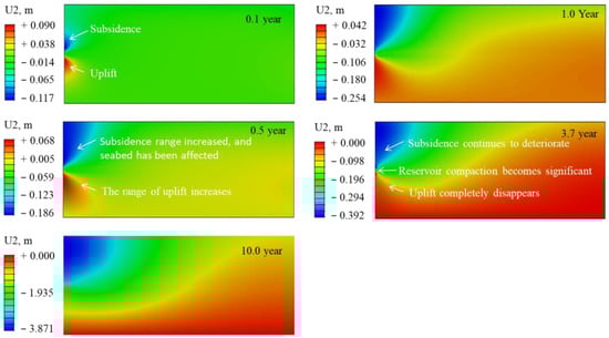 The dissociation of gas hydrates and the subsidence of sediments during the development process can adversely affect the stability of subsea equipment, such as wellheads [65,66,67]. In this section, the evolution characteristics of the wellhead during the development process are investigated, and the evolution of the wellhead sinking and seabed subsidence throughout the entire development process is shown in Figure 18. Notably, the wellhead not only sinks along with the subsidence of sediments but also experiences additional sinking due to a decrease in bearing capacity throughout the development process. The additional sinking of the wellhead is defined as the relative sinking in the present work.