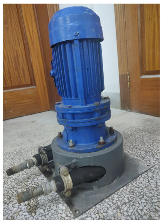 The PLC control cabinet adjusts rotor speed, the pressure sensors measure outlet pressure pulsations, and the electromagnetic flow meter records the average outlet flow rate. A valve is installed at the end of the outlet pipeline to regulate pressure by adjusting the valve opening, while a level valve maintains stable inlet pressure. The inner and outer diameters of both inlet and outlet pipes are 25 mm and 32 mm, respectively. With water as the test material, the testing system and test pump are shown in Figure 8. The pump was started following all standard procedures and operated until suitable working conditions were achieved.