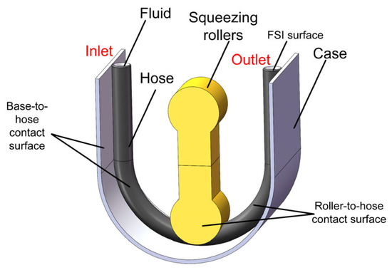 Three-dimensional finite element model of the two-roller hose pump.