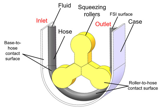 The research team primarily uses two types of hose pumps: two-roller and three-roller, shown in Figure 1 and Figure 2. To investigate the pulsation characteristics of hose pumps with different roller counts, a three-dimensional bidirectional FSI model of the hose pump was established. The bidirectional FSI models of both types of hose pumps consist of three main parts: the casing, the compression rollers, and the rubber hose. Model parameters of the hose pumps are listed in Table 1. An eight-part computational domain was developed for numerical simulation, comprising the inlet, outlet, compression rollers, casing, rubber hose, contact surfaces between the casing and hose, contact surfaces between the rollers and hose, and the fluid–structure coupling surfaces, as shown in Figure 3 and Figure 4.