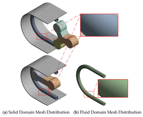 The extrusion of rubber hoses in peristaltic pumps is a highly complex nonlinear problem involving geometric, material, and contact nonlinearities. Achieving convergence in the simulation is challenging due to the significant deformations and interactions between the rollers and the hose. To address this, the mesh for the fluid and solid components is separated, with fine mesh sizes of 2 mm applied to the hose and fluid regions, ensuring accurate resolution of these critical areas. In contrast, a coarser mesh of 15 mm is used for less critical parts. High-order tetrahedral elements (Solid187) are chosen to balance computational efficiency and precision. The overall mesh distribution is shown in Figure 5. Additionally, dynamic mesh techniques such as smoothing and remeshing are implemented to handle the evolving fluid boundaries and shapes throughout the simulation.
