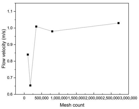 To ensure mesh independence, a mesh sensitivity analysis was conducted. Using the two-roller pump as an example, a monitoring point was placed at the outlet (0.044, −0.113, −0.090), with flow velocity used as the reference parameter for assessing mesh independence. The analysis compared mesh counts of 1.03 × 105, 1.75 × 105, 3.45 × 105, 8.05 × 105, and 2.71 × 106 in the fluid domain. The results showed that when the mesh count exceeded 3.45 × 105, the flow velocity at the monitoring point stabilized, as shown in Figure 6.