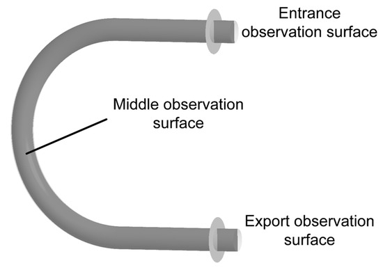 To analyze the flow field and pulsation characteristics within the hose, observation surfaces were set up on the hoses of both types of hose pumps at distances of 24 mm from the outlet and inlet positions, as well as at the midpoint. Pressure contour plots of the cross-sections were generated, as shown in Figure 7.