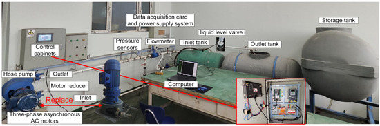 The experimental testing was conducted on an open test bench system. The system comprises actuators (two types of hose pumps), a programmable logic controller (PLC) (Xiankong, China) control cabinet, pressure sensors (0–5 V), an electromagnetic flow meter, level valves, control valves, and a computer. The specific parameters of the main experimental instruments are shown in Table 4.
