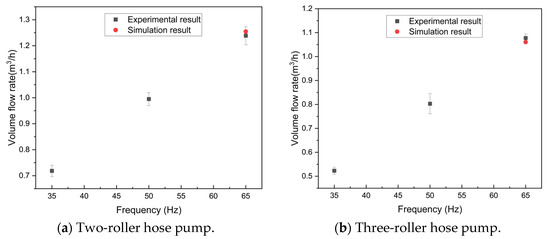 The simulation in this study uses a power frequency of 65 Hz and an outlet pressure of 0 MPa as boundary conditions. According to Formula 5, the inlet velocities are calculated to be 0.71 m/s and 0.6 m/s, respectively. The fluid material was specified as water. A comparison of the experimental results with the simulation results for the volume flow of the hose pumps is shown in Figure 9, with the error between the experimental and simulated results maintained within 5%, confirming the accuracy of the model.