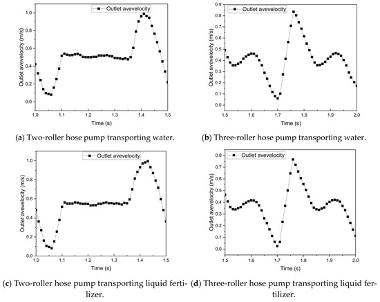 For the average outlet pressure, as shown in Figure 11, the two-roller pump exhibits significantly higher outlet pressure than the three-roller pump. The maximum average outlet pressures for the two-roller pump when transporting water and liquid fertilizer are 1813.516 Pa and 2024.228 Pa, respectively, compared with 571.813 Pa and 1961.310 Pa for the three-roller pump. According to the Navier–Stokes equations, areas with higher pressure gradients naturally exhibit higher velocities, indicating a clear correlation between outlet pressure and flow velocity. Based on Equation (6), the outlet pressure pulsation intensities of the two-roller pump for high and low Reynolds number fluids are 2118.606 Pa and 2245.519 Pa, respectively, while those of the three-roller pump are 793.048 Pa and 2201.112 Pa, respectively. In terms of pressure, the three-roller pump exhibits lower pulsation intensity compared with the two-roller pump.
