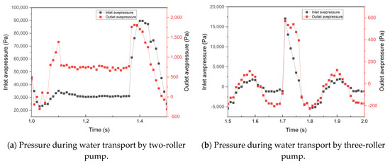 Regarding the average inlet pressure, the trend is similar to that of the outlet pressure. Generally, the inlet pressure of both pumps is higher than the outlet pressure. However, an exception is observed in the three-roller pump when transporting water, where the outlet pressure exceeds the inlet pressure between 1.60 and 1.70 s, a phenomenon not observed in the two-roller pump.