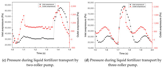 In field fertilization applications, a power frequency of 65 Hz is typically selected to achieve rapid fertilization. Therefore, under the conditions of a rotor speed of 6.549 rad/s and an outlet pressure of 0 MPa, this study compares the average outlet and inlet pressures of two-roller and three-roller hose pumps when transporting water and liquid fertilizer. Here, water represents a high Reynolds number fluid, and liquid fertilizer represents a low Reynolds number fluid.