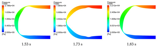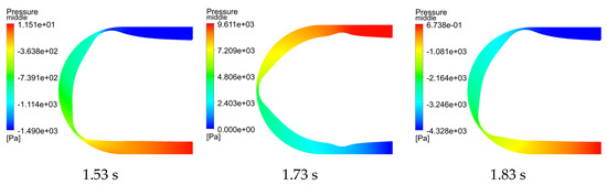 To observe the overall flow field within the hose and understand the pulsation of pressure and flow velocity throughout the entire flow area, analyses were conducted on the pressure and flow velocity contour plots at the midpoint. For the two-roller pump, contour plots were generated at 1.08 s, 1.22 s, and 1.38 s, while for the three-roller pump, contour plots were generated at 1.53 s, 1.73 s, and 1.83 s, as shown in Figure 12, Figure 13, Figure 14, Figure 15, Figure 16, Figure 17, Figure 18 and Figure 19.