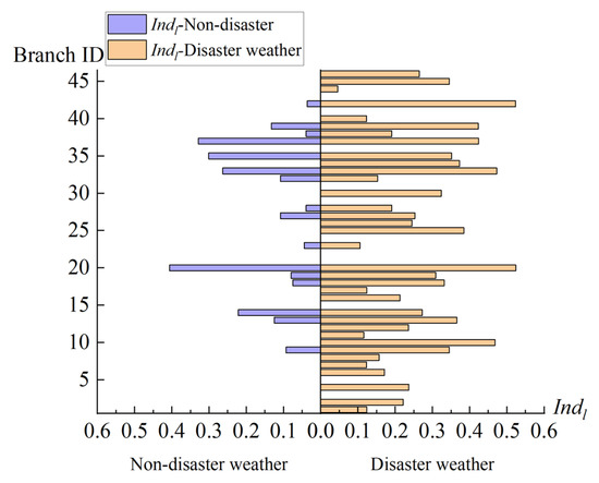The natural disaster corresponding with the highest operational risk value, heavy rain, and flooding, has been selected as the target for the assessment of cascading failures in the power system under disaster conditions. The assessment results are shown in Figure 2 below. The ordinate of Figure 2 represents the ID of the transmission line that may trigger cascading failures under natural disasters, while the abscissa represents the simulation results of the Indl index for the corresponding transmission line triggering cascading failures. The higher value indicates the greater probability of cascading failure occurring on that line. The purple bar chart on the left side shows the simulation results of system-cascading failures without natural disasters, while the yellow bar chart on the right side represents the simulation results of system-cascading failures under heavy rain and flooding disasters. Placing them side by side facilitates a comparative analysis of their differences.