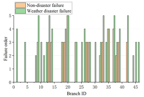 Figure 3, as a supplement to Figure 2, shows the failure order of the cascading failure path that each branch may trigger before and after considering bad weather. It can be found that when experiencing extreme weather, the propagation path of cascading failure increases; that is, there will be more transmission line outage events.