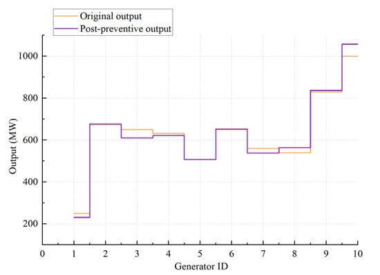 During the prevention phase, adjustments to the output of generator units are made to optimize the power flow distribution, thereby reducing the operational pressure on the system and preemptively mitigating the severity of potential power flow overloads caused by faults. The outcomes of preventive control are illustrated in Figure 4.