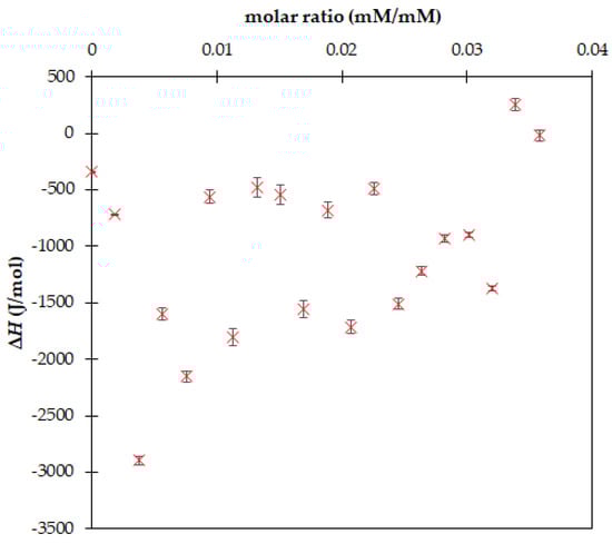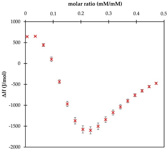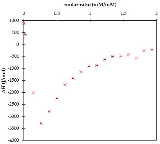 As mentioned above, procedure A was first applied to all three pharmaceuticals and fulvic acids. The experiment course, as well as the obtained experimental data, met the requirements only in the case of ibuprofen (see the example of experimental data in Figure 1). As can be seen, interactions between ibuprofen and fulvic acids are exothermic and change in binding enthalpy is a negative value. The minimum in ΔH value was indicated around the molar ratio equal to 0.2. In order to calculate changes in Gibbs energy and entropy, we adopted the simple mathematical model presented for interactions of pharmaceuticals with chitosan [] and hemoglobin [], as well as humic substances with metal ions []. According to the model, the change in Gibbs energy ΔG can be expressed as