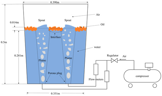 In a typical experiment, deionized water was added to the ladle model to reach a height of 281 mm (28.92 L) or 351 mm (36.64 L), depending on the aspect ratio. The initial concentration of thymol in each experiment was 100 ppm. The amount of thymol, about 290 mg, is first dissolved in warm water to improve its dissolution rate. The oil, petroleum ether, was slowly poured on top of the water. The thickness for 3% and 5% and Hw/D = 0.8 was 8.4 mm and 14 mm, respectively; for an aspect ratio of Hw/D = 1.0, the corresponding values were 11 mm and 17.5 mm.