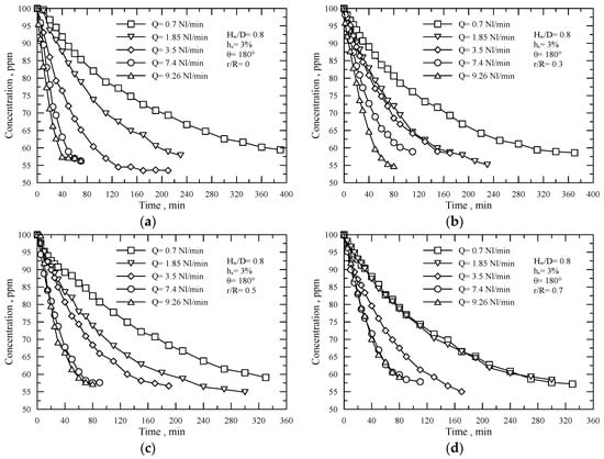 Figure 6 shows the experimental results for the concentration of thymol in water as a function of time at different gas flow rates and porous plug radial positions for the constant conditions of the ladle aspect ratio, the slag thickness, and the separation angle. The initial concentration rapidly decreases at the beginning and slows down at the end. This is a typical behavior for first-order kinetics. From these plots, it can be observed that the gas flow rate has a large influence on the refining rate, which increases as the gas flow rate also increases.