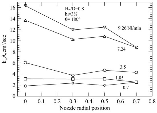 Effect of the radial position on the volumetric mass transfer coefficient for different gas flow rates.